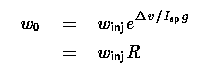 for which the Delta-v is the velocity change including all loss mechanisms, including back pressure, and the Isp is the vacuum specific impulse. Similarly, the propellant weight wprop is merely w0 - winj, or:
