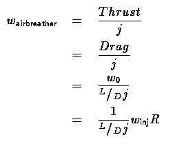 The airbreathing engine thrust to weight ratio j must be referenced to the tanker disconnect condition and include installation effects. Thus the thrust will be lower and the weight higher than the sea level static numbers you look up in an engine book or in Jane's. The condition for the airbreather is that if it is present it must be able to sustain the vehicle in level flight behind the tanker, and hence its thrust must be equal to the drag the vehicle sees at disconnect. As a result,