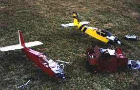 Jay Moore and I get our planes ready for taxi tests without the wings attached. Both planes are Goldberg Eagle II's. Mine, on the left, has a OS 40 FP engine. Jay's has a Super Tigre .45.